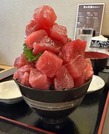 名称:マグロノドン(赤身・タワー) 体長:高さ22センチメートル(推定) 体重:身の部分だけで、500グラムはあると思われる。ご飯の量を加味するとキロ越えも… 価格:2,700円(税込) 想像をはるかに超える見た目!!果たしてどれほどの赤身が使用されているのか…