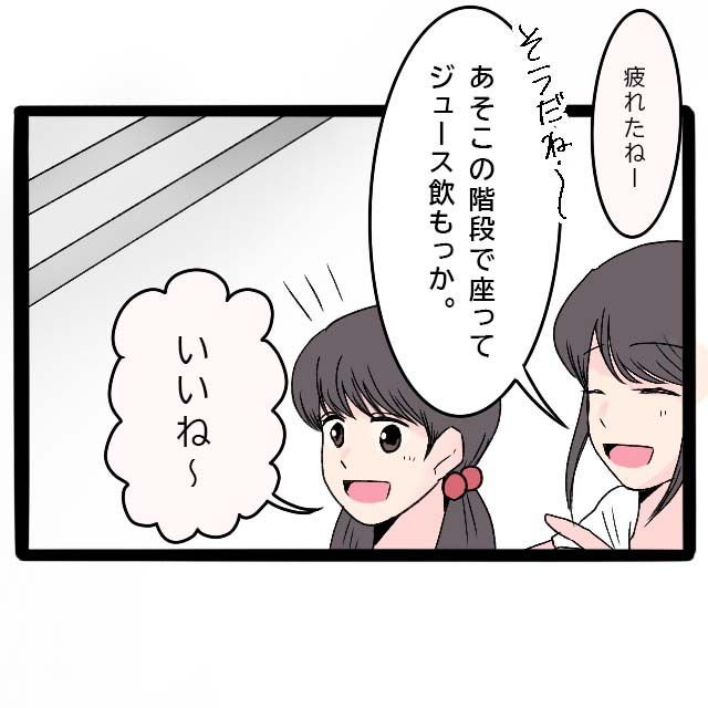 「疲れたね~。」「あっ。あそこで座ってジュースを飲もうか。」「うん。いいね~。」