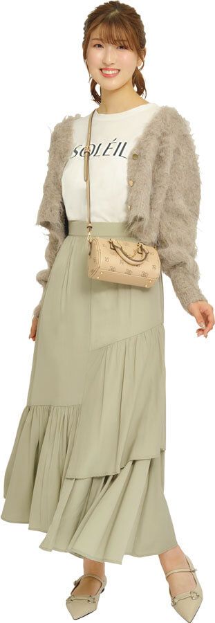 ニュアンストーンでまとめれば、フェミカジュスタイルもリッチな印象。ミックスカラーのようなニュアンスとマットな金ボタンが高見えなカーデは立体的なふわふわ素材がカジュアルなTシャツとマッチ。ティアードとアシンメトリーの立体感をいかせるとろみ素材のスカートは、ストンと落ちるラインでも足さばきがいいからアクティブなシーンでも大活躍!