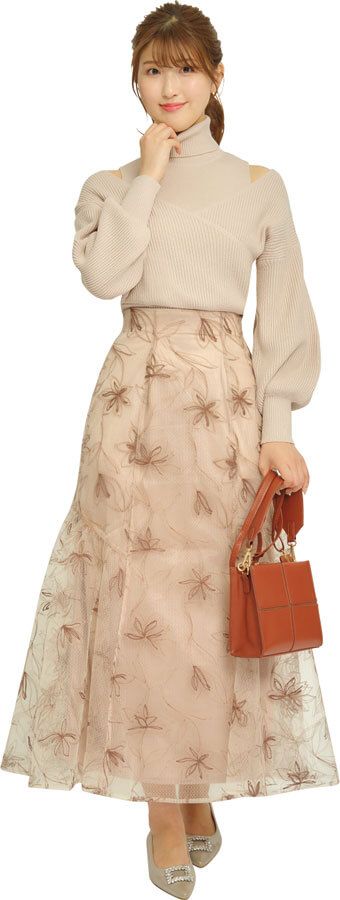 レイヤード風トップスは、中と外でリブの幅が違うので立体感が出て高見え度抜群。生地は中でつながった1枚仕立てだから、着崩れる心配もなし♡ スカートはチュールに施された刺しゅうと、両サイドの切り替え部分に入ったたっぷりギャザーで立体感はばっちり! 主役をはれるスカートです。