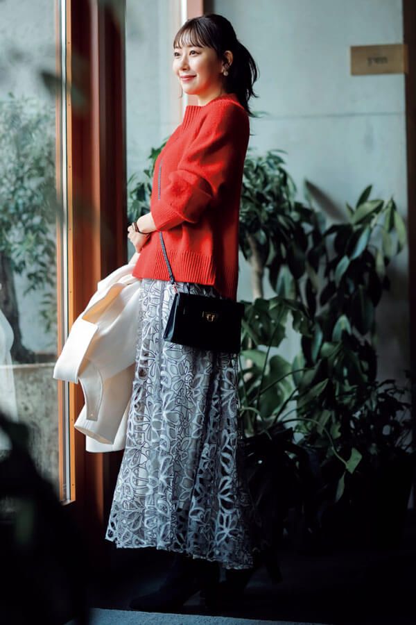 ゆるニット×レースフレアのワンツーコーデに赤で変化球。インパクトのある赤ニットには、立体的なカッティングレースがマッチ。相乗効果で高級感がアップして、こなれて見えます♪