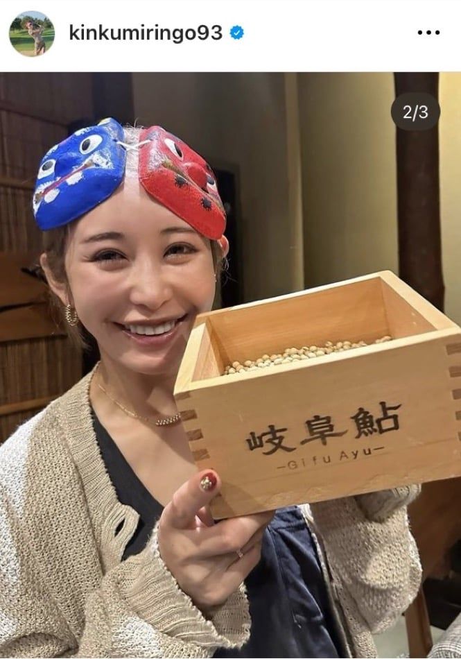 2人はそれぞれSNSを更新、豆をいっぱいいれた枡を持ち、赤と青の鬼のお面をつけている様子を公開しています。