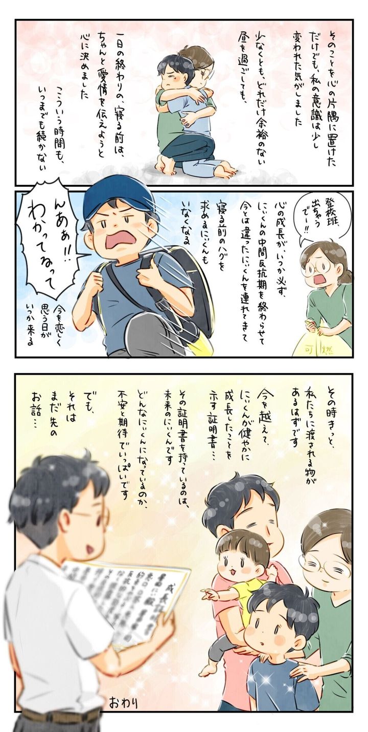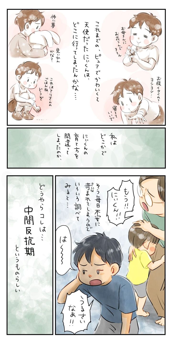 最近、イヤイヤ期とは違う、反抗的な態度を取るようになった、にいくん。その様子に、どう対応してよいのか、星田つまみさんは悩みます…。「中間反抗期」の息子とどうやって向き合うのでしょうか。