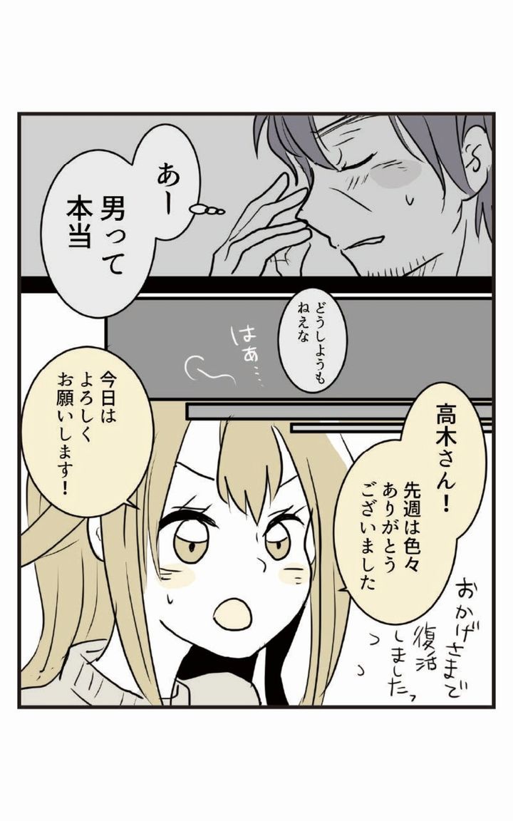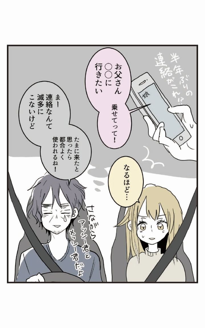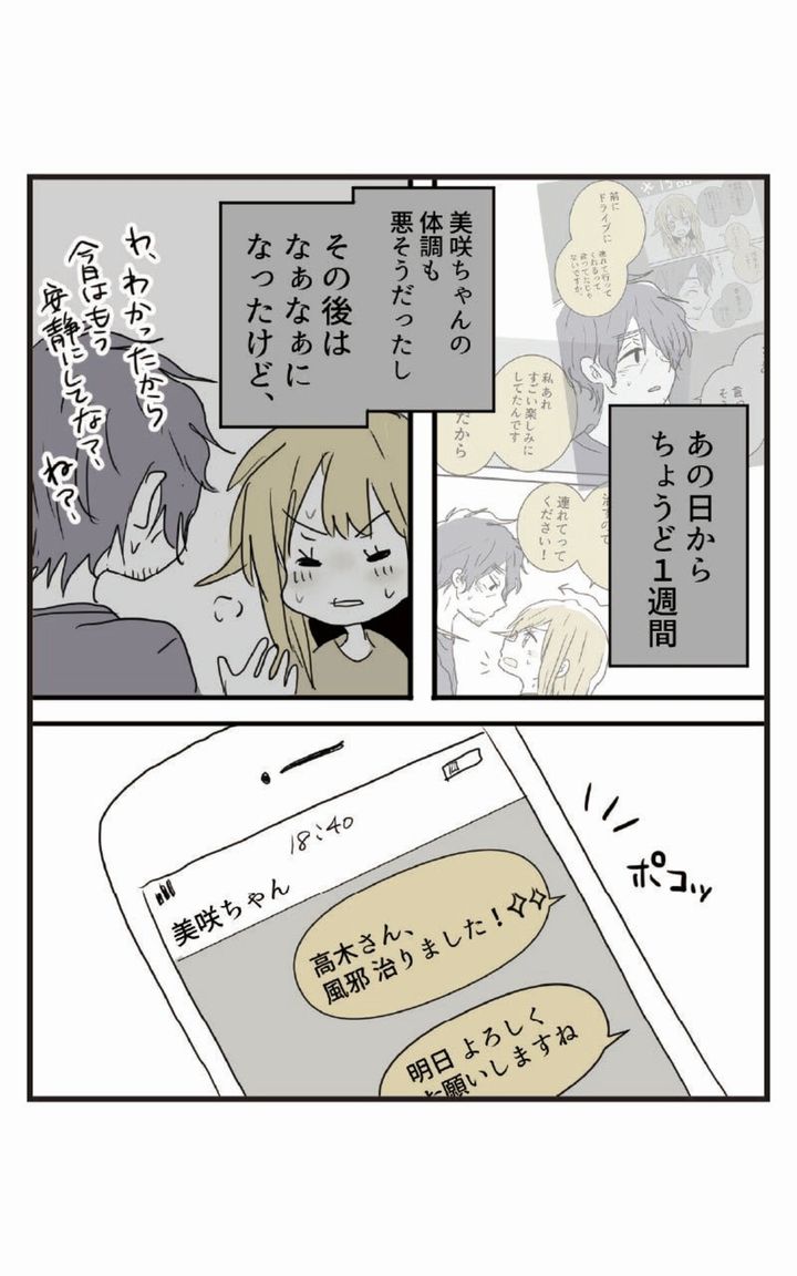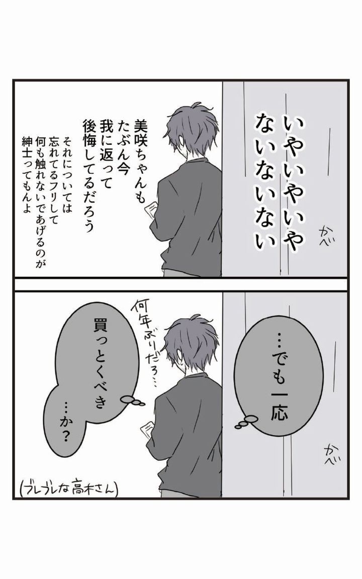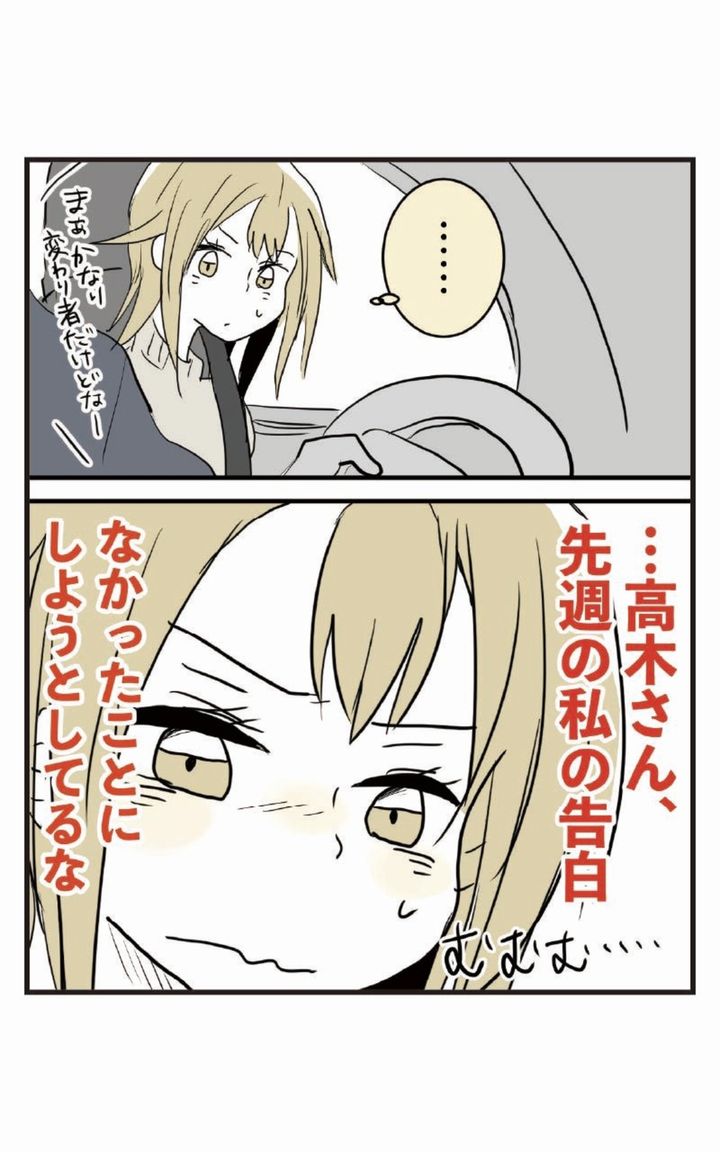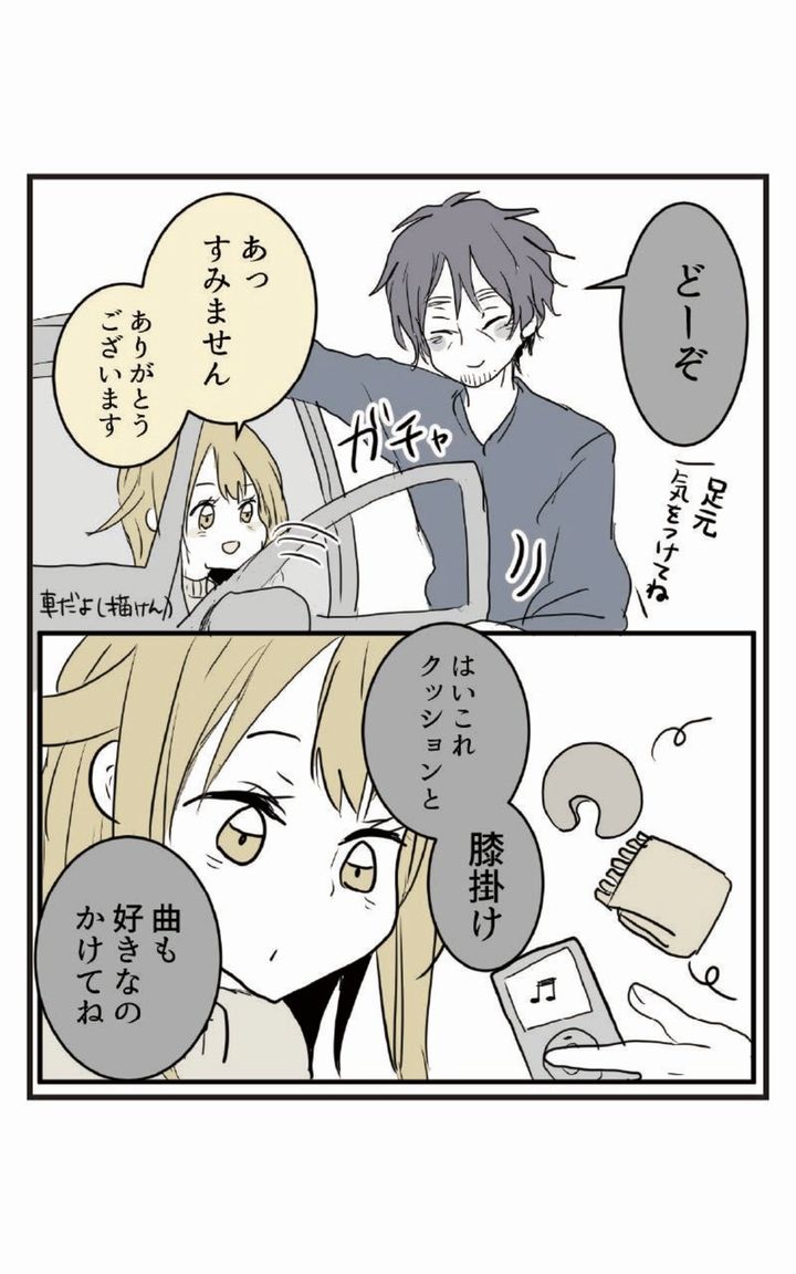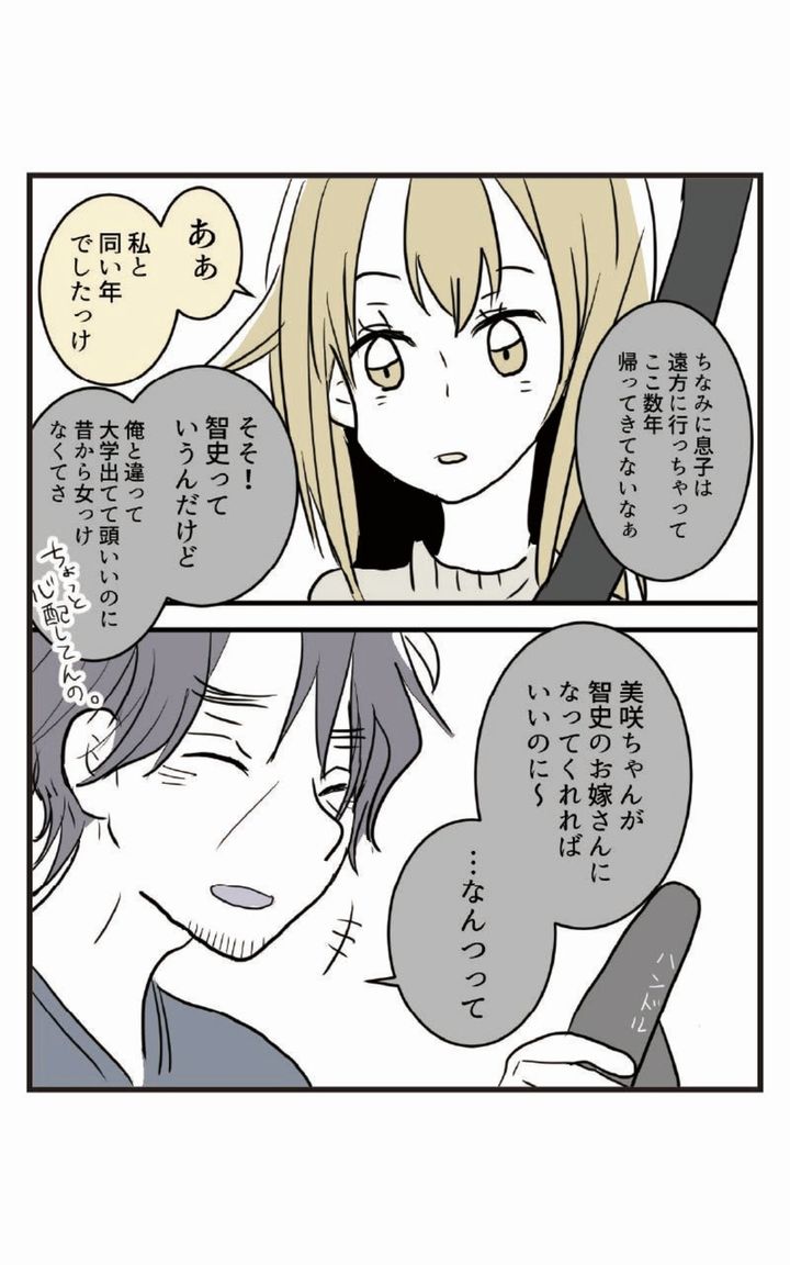女性を車に乗せるのに準備の良い高木さん。隣町に住む娘さんに頼まれ、車を出す機会があるのだとか。冗談めかして「息子と結婚してくれればいいのに」などと、美咲さんの告白を無視した発言も。美咲さんはモヤモヤを抱えています。