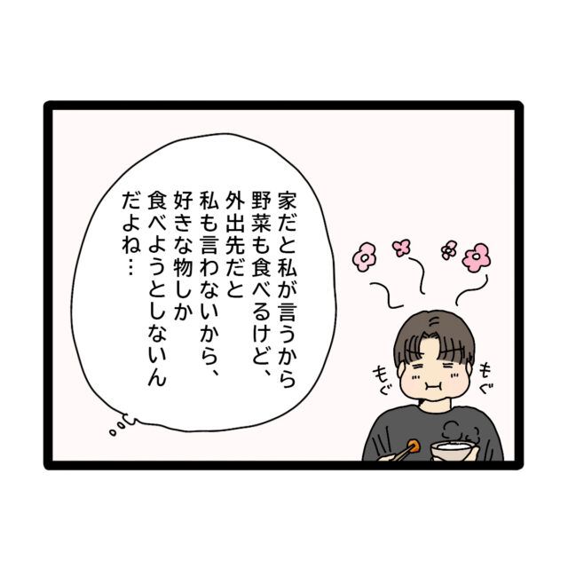 家だと、私が言うから野菜も食べるけど、外出先だと私も言わないから、好きな物しか食べようとしないんだよね・・