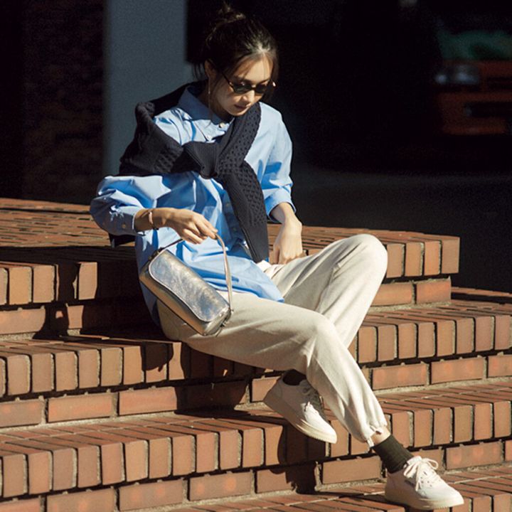 サングラス¥53,130(ミュウミュウ/ルックスオティカジャパン カスタマーサービス)シャツ¥19,580(ザ シンゾーン/シンゾーン 表参道本店)ニット¥9,990(アンフィーロ/オンワード樫山)パンツ¥12,100(チャンピオン/チャンピオン ブランドハウス シブヤ トウキョウ)バッグ¥146,300(J&M デヴィッドソン/J&M デヴィッドソン カスタマーセンター)ソックス¥1,320(タビオ/tabio)スニーカー¥37,400(オートリー/トヨダトレーディング プレスルーム)ピアス¥31,900(マリハ)