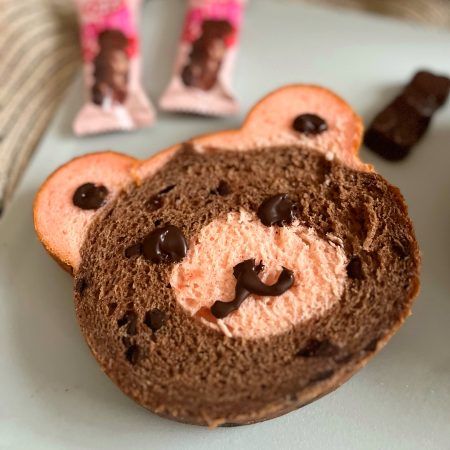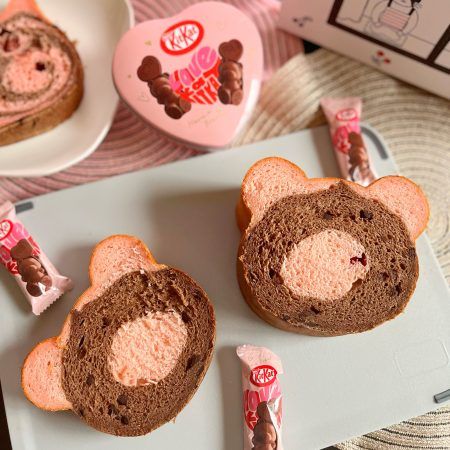 こちらは、チョコチップを練り込んだチョコ生地をベースに、耳と鼻部分は『キットカット ハートフルベアー』のパッケージカラーをイメージしたいちごチョコ入りのいちご風味の生地を組み合わせています。