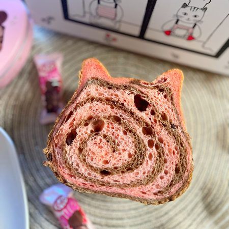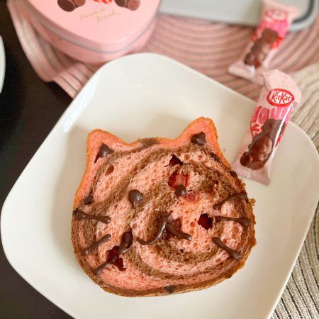 この「キットカット ハートフルベアー」と、「ねこねこ食パン」がコラボして、ストロベリーを練り込んだピンク色の生地と、ぐるぐる模様が可愛い食パンが完成しました!