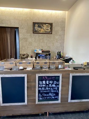駐車場はお店の横に、2台ほど置けそうです。可愛い看板があり、臼と杵のデザインされた白い暖簾をくぐり、店内に入ると、、癒される餅菓子に目を奪われます。