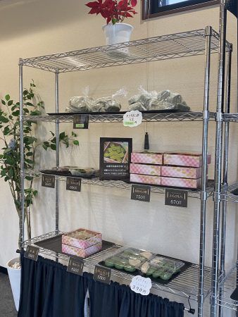 右側の棚には、わらび餅、抹茶わらび餅、おはぎ、栗おこわ、草もち、そしてお稲荷さんと、各種並んでいます。
