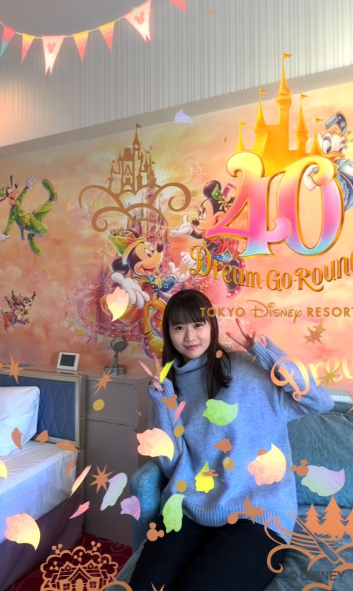 今回は「ウィッシュ」のディズニーリゾート40周年記念のお部屋に宿泊したのですが、客室の絵が通常の部屋とは異なり、スマートフォンで客室に設置されたQRコードを読み取ると専用のコンテンツが起動して、40周年のマークやガーランドで装飾された写真も撮れるようになっていました♪