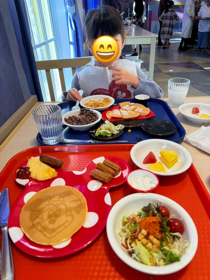 セレブレーションホテルでは朝食バイキングがあり、大人は1,900円。子どもは900円で食べることができます(3歳以下は無料)。バイキングのメニューは、ミッキーのパンケーキ、ミッキー型ハンバーグもあり、ディズニーランドを後にしてからもディズニー気分を味わうことができて楽しい朝食になりました。