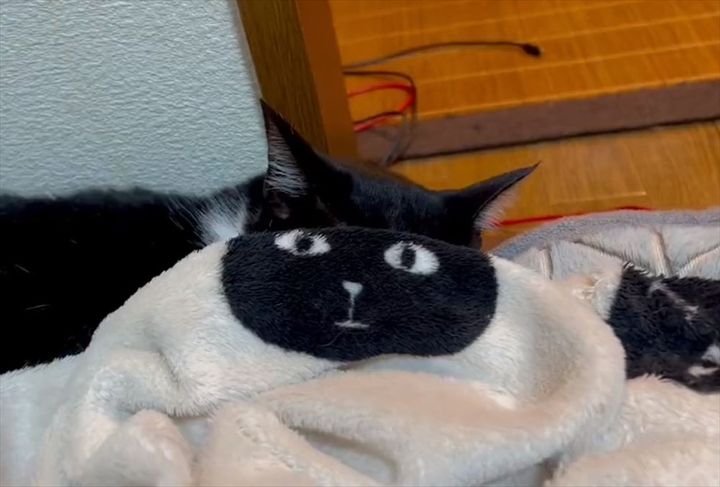 あまりにもフィットしすぎているため、ブランケットの猫の顔が本物の猫のように見えてきます。