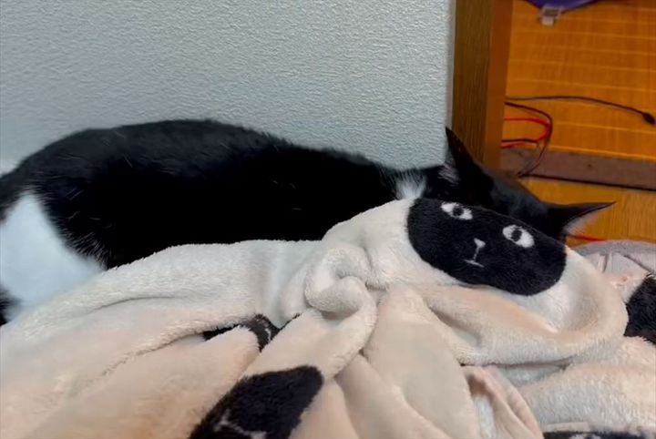 愛猫とブランケットが重なった、奇跡の瞬間を公開されています。