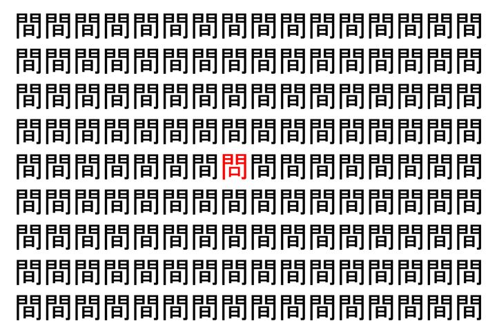 画像の中には、「間」という漢字が縦に9行、横に16個並んでいます。 全部で144個となりますが・・・、そのうち1つは「異なる漢字」となってますよ!!