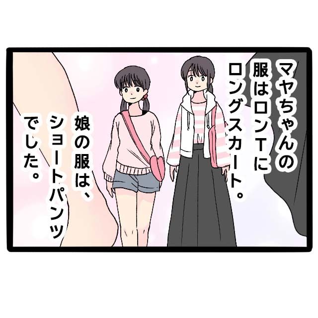 いとこは、ロンTにロングスカート、娘は生足のショートパンツ・・・。