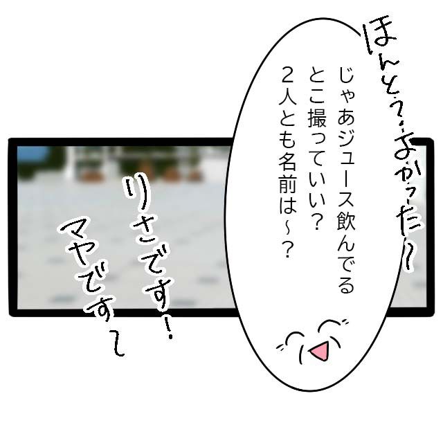2人に許可を得たおじさん。「ほんと?よかった~。ジュースを飲んでいるところ撮ってもいい?名前は??」と即席撮影会が始まり、なんとそこで名前も伝えていました。
