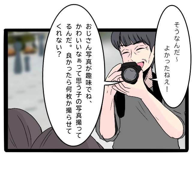「そうなんだ~。よかったねぇ。」優しく話すおじさん。「おじさん写真が趣味でね。かわいいな~って思う子の写真を撮ってるんだ。良かったら何枚か撮らせてくれない?」と伝えてきたそうです。