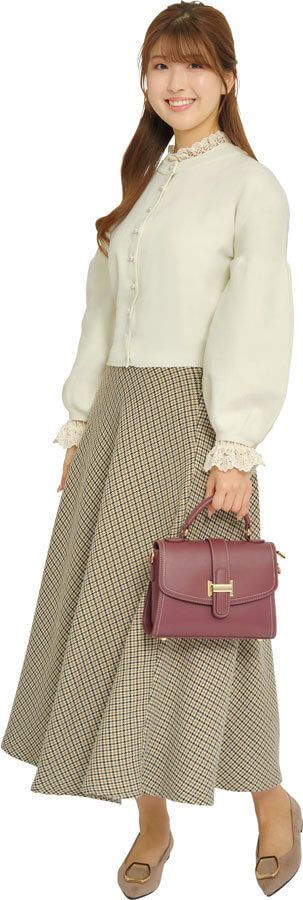 カーディガン¥4,950/index ブラウス¥4,990/クチュール ブローチ(ワールドプレスインフォメーション) スカート¥2,099、バッグ¥1,699、パンプス¥1,599/以上GRL