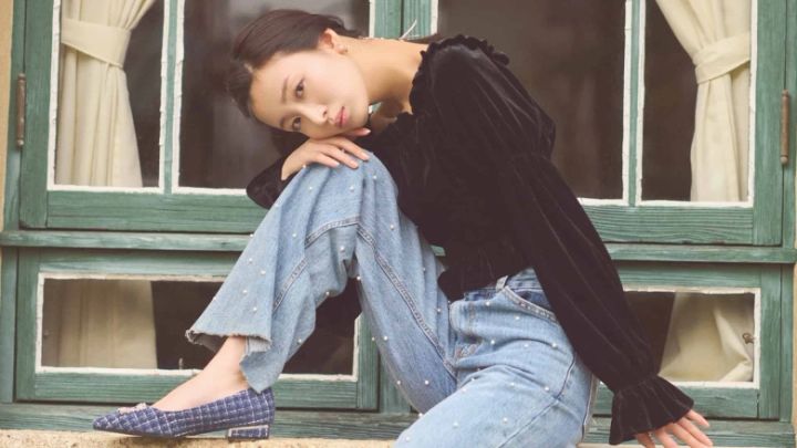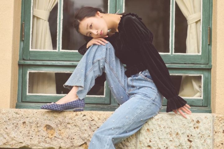パールデニムパンツ 27,500円/The Girls Society ベロアトップス 7,590円/dazzlin イヤリング 3,780円/アビステ パンプス 7,500円/オリエンタルトラフィック(ダブルエー) リボン/スタイリスト私物