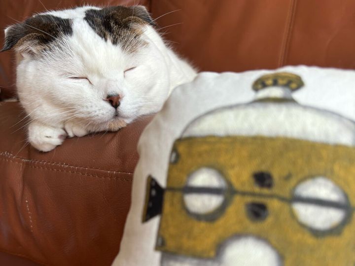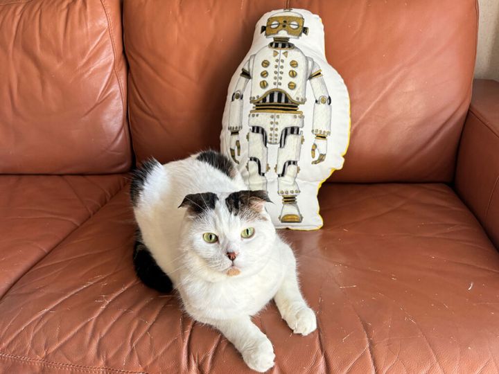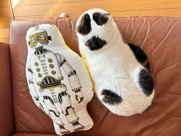 後ろになんかおる! 飼い主が好きなバンド、スピッツのグッズやで。遮光器土偶をモチーフにしたロボットやねんて。