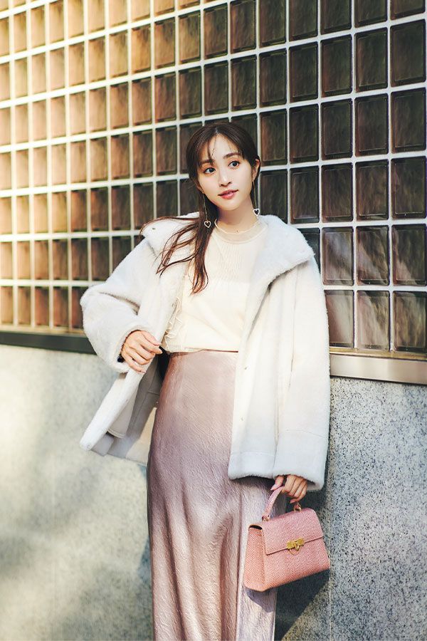 ゴージャスになりすぎないハーフ丈で旬の質感をゲット♪ コートにややボリュームがあるぶん、中は部分シアーブラウス×光沢ナロースカートで、抜け感を出して着痩せに調整を。お尻が隠れる丈感とふわもこ素材で暖かさも申し分なし!