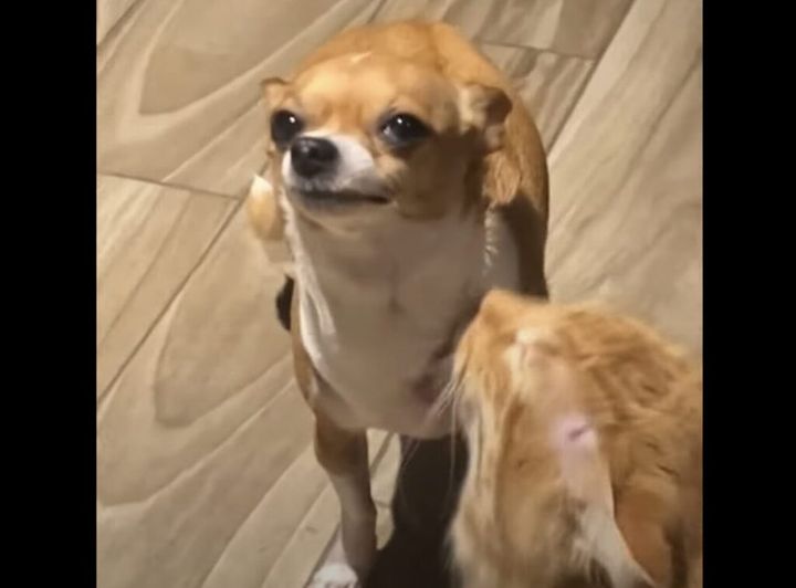 3. イヤってはっきり言えないタイプの犬、固まって猫の毛づくろいを我慢