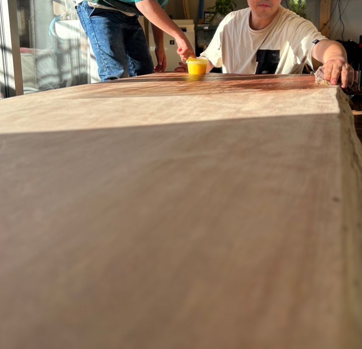 脚を取り付けて子どもと一緒に蜜蝋のWaxを塗っていきます。因みにこの蜜蝋のWaxも自分で作りました。(作り方はまた別のブログで紹介したいと思います)子どもも塗る度に色が変わっていくので楽しそうでした。脚は前述の吉野杉のテーブルに付いていたものを取り付けました。