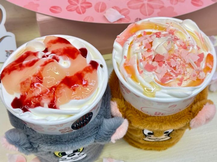 今回のコラボドリンクは、「桜舞う ハニークリームラテ」と「&TEA 桜香る ピーチメルバロイヤルミルクティー」の2種類。いずれもトッピングの味とビジュアルが華やかで、暖かな春を思わせます。ホットとアイス両方で用意されているので、気分や気温にあわせて選べるのも◎。