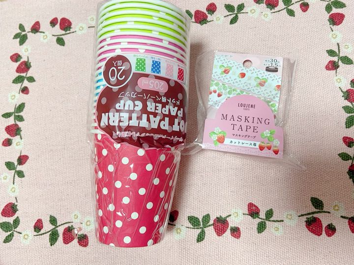 家に余っている紙コップでもOKですが100均に行ったら柄付きのコップがいろいろ売られていたので今回はセリアで水玉の紙コップを買ってきました!