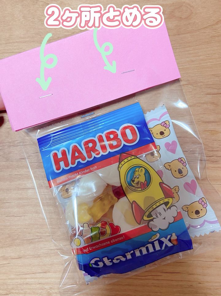 お菓子を透明袋に詰めて上部を画用紙で挟みホチキスで2か所止めます。今回はダイソーで購入した透明袋を使用しています。