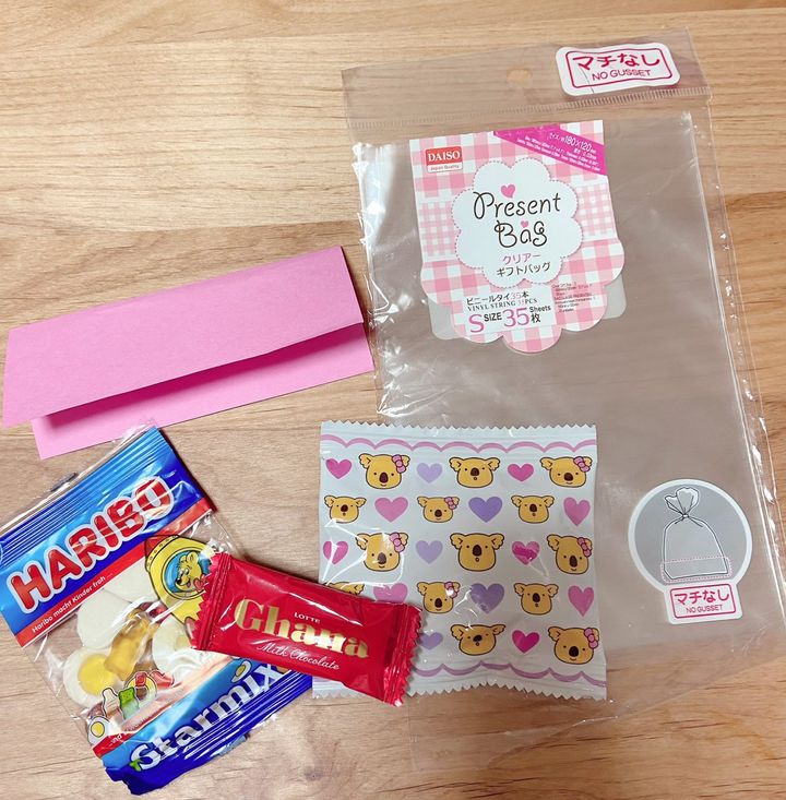 でも袋に入れてテープで止めるだけではちょっとつまらないですよね。そこで、簡単にできるラッピングを2つご紹介したいと思います。どちらも材料は全て100均で揃いますよ!