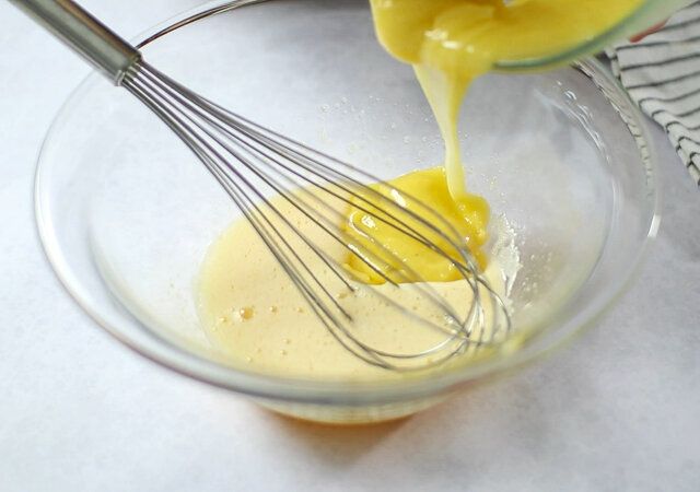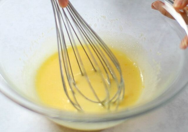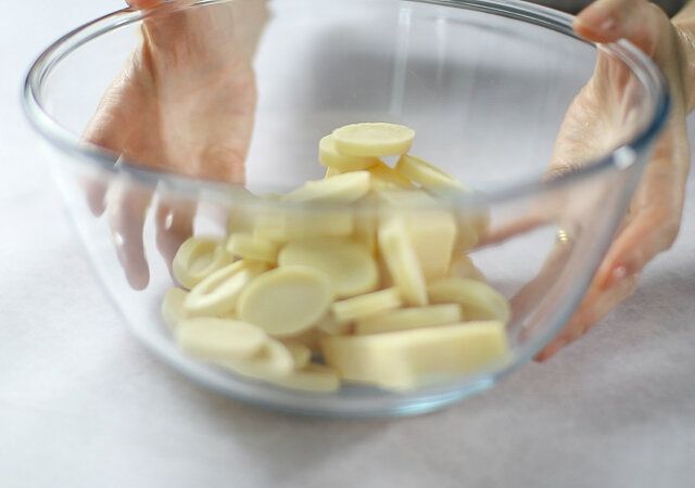 ① ホワイトチョコレートとバターを合わせて湯煎またはレンジで溶かします。(ホワイトチョコレートは高温で溶かすと焦げてしまうので、混ぜながらゆっくりと低温で溶かします。ホワイトチョコレートとバターが分離してしまうときはホイッパーで力強く混ぜ合わせるとだんだんとマヨネーズのような感じに乳化してきます。)