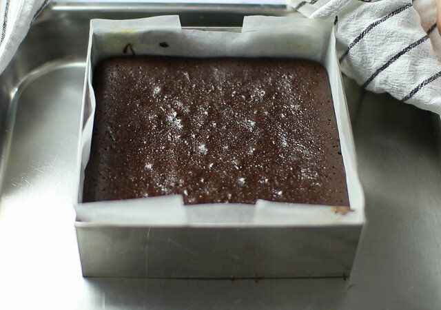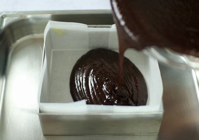 ガトーショコラは丸いケーキ型で作ることが多いと思いますが、今回は切り分けやすいように低めのスクエア型で作ってみました。スクエア型は色々なかたちに分けやすく、ラッピングもしやすいので便利です。お好きなかたちに切り分けてプレゼントにぜひ!