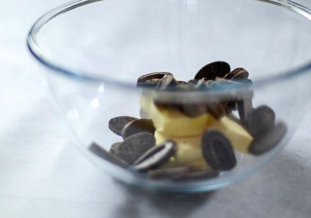 ① チョコレートとバターを合わせて湯煎またはレンジで溶かします。