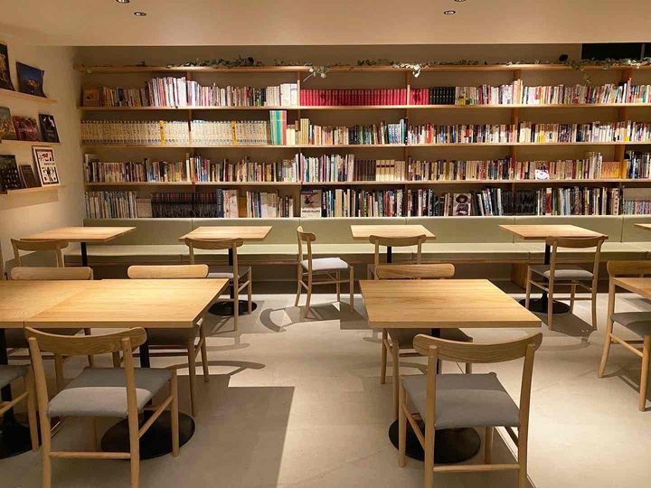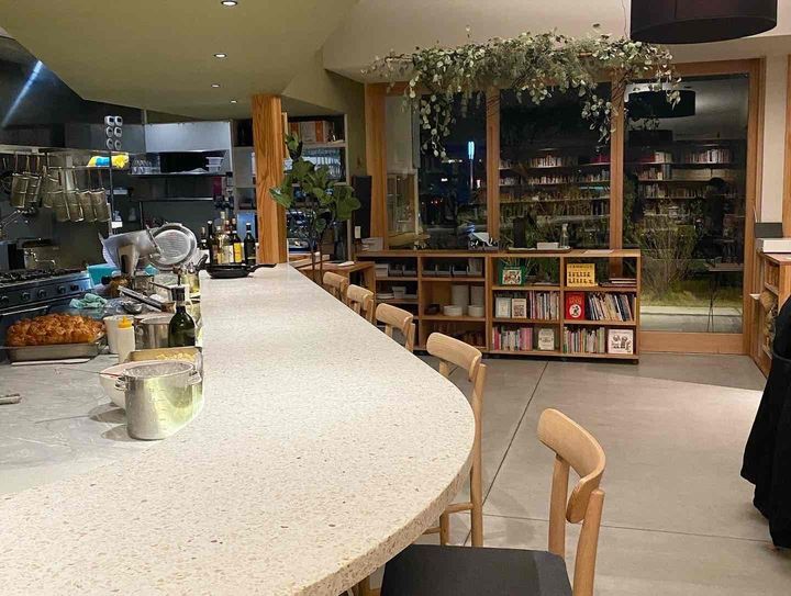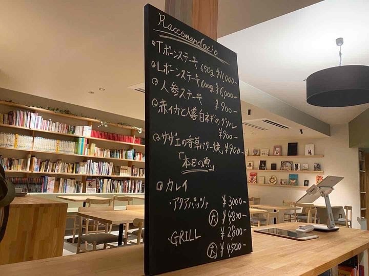 壁側に並ぶのは、さまざまなジャンルの古本。お子様向けの本や授乳スペースもあり、お料理以外のサービス面も素晴らしいです。