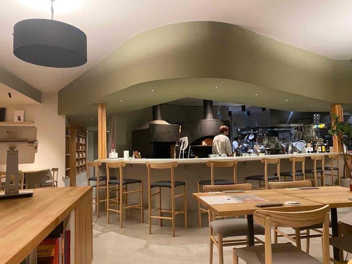 店内の雰囲気を作り上げる、曲線がオシャレなカウンターのデザイン。カウンターの中にはピザ窯があり、焼き上がるピザの存在を感じながらお料理をいただくことができます。