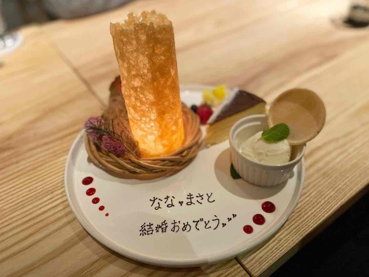 私ごとですが、家族が結婚祝いにプレートを用意してくれていました。もなかと合わせていただくジェラートとベイクドチーズケーキもとても美味しく、最後まで幸せな時間を過ごすことができました♡