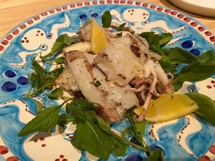 「赤イカと入善白ネギのグリル」900円は、火が入っても透明感のある赤イカと富山県入善町産白ネギの甘さが組み合わさると絶品。レモンで味変をすると、さらに爽やかな美味しさになりました。
