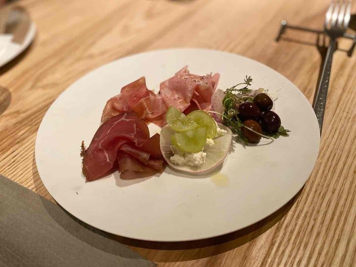 「生ハムの盛り合わせ」1,700円(以降全て税込)には、オリーブやマスカットも添えられていて色合いがとてもきれいでした。