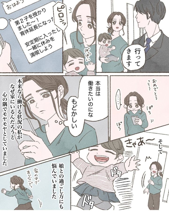 本作では、それでも働きたい気持ちを諦めきれず、少しずつ行動をした女性の姿が描かれています。その結果、1年後には保育園に通えるようになります。入園の点数を稼ぐために、一時保育を利用しながら仕事を再開する方法もありますね。働きたいと考えているママへ、勇気をもらえる作品です。