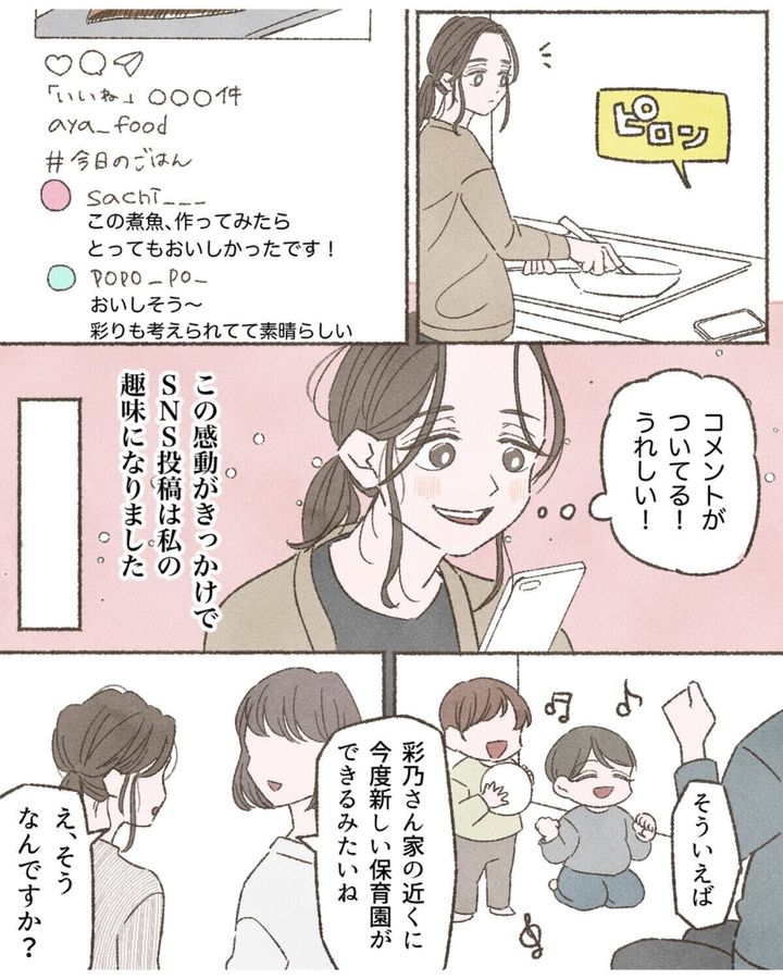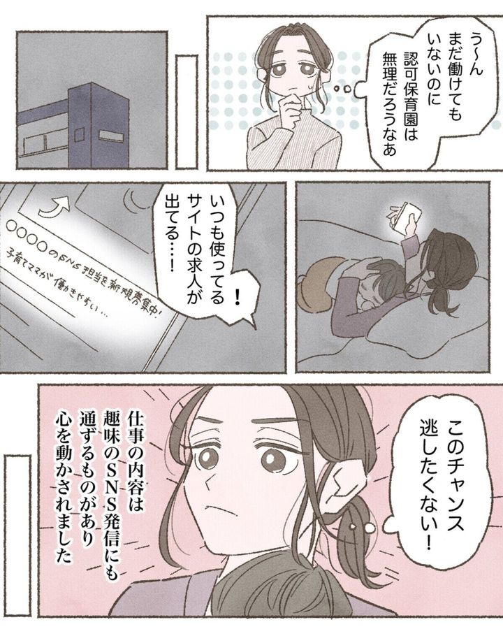 SNSを始めたことがきっかけで、仕事への興味の幅が広がった彩乃さん。さらにいいタイミングでSNS運用に関する求人を見つけます。実母の協力と一時保育を利用し、仕事を始めます。仕事と家庭の両立に対する不安を抱きながらも、ずっと働きたかった思いをかなえることができました。
