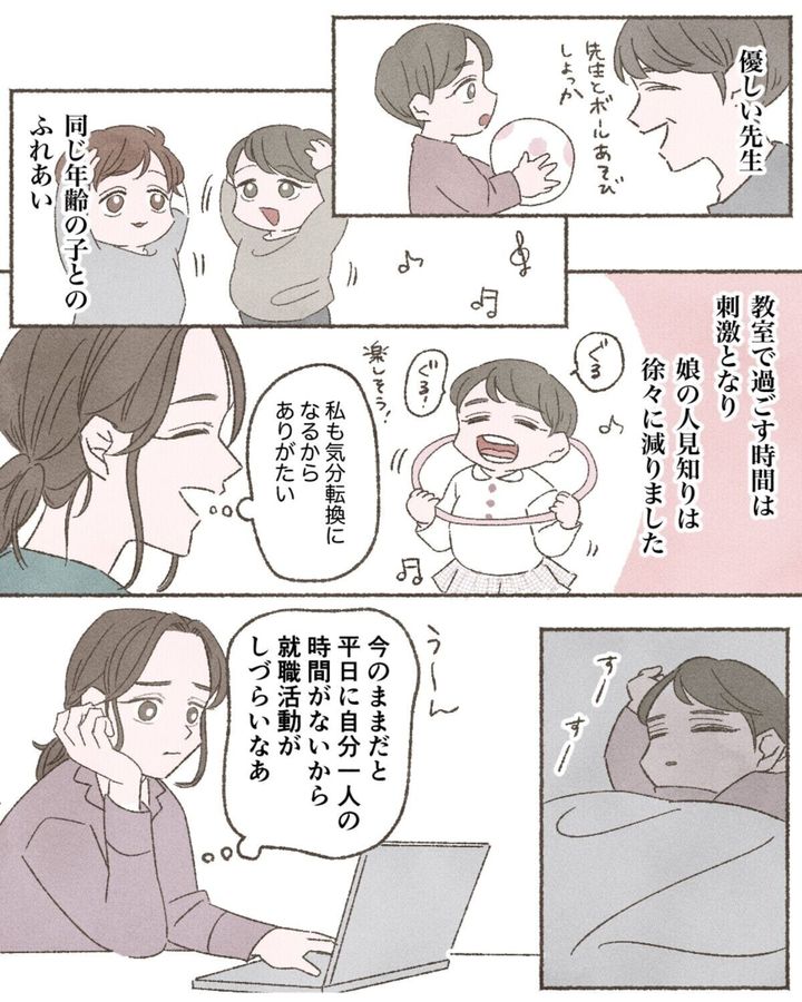 働きたい気持ちとは裏腹に、家で過ごしている状況にモヤモヤを抱えていました。ですが、落ち込んでばかりはいられません。子どもの習い事をきっかけに、娘の成長を感じます。それと同時に気分転換ができるようになり、転職活動についても前向きに行動できるようになります。