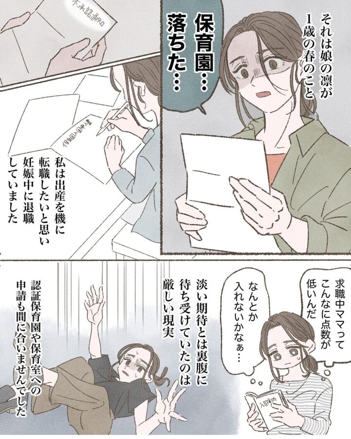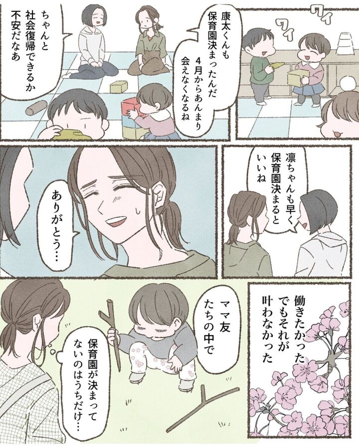妊娠を機に仕事を退職した彩乃さん。転職しようと考えていましたが、求職中での保育園入園は簡単ではありませんでした。さらに、まわりのママ友は保育園が決まり、4月から職場復帰を果たします。まわりから取り残されてしまったような孤独を感じます。