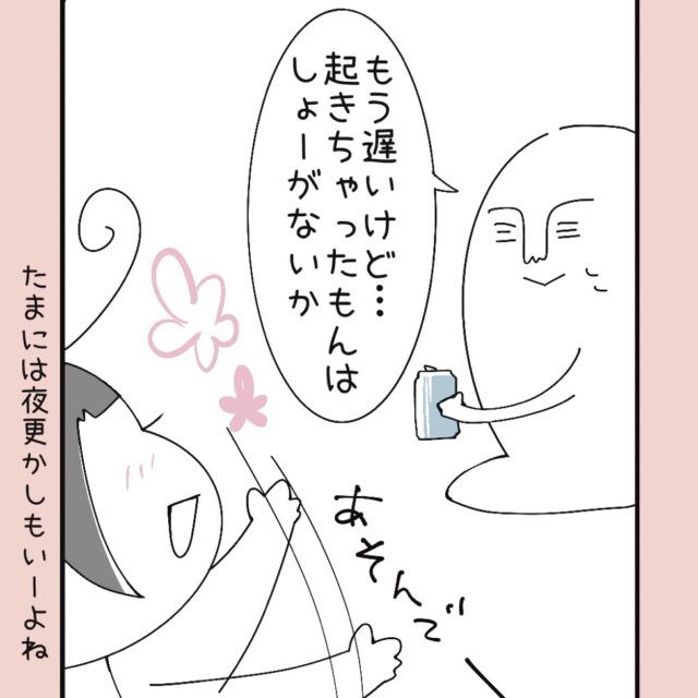 どうせ寝ないのならば、早く寝かせなきゃと焦ってイライラするよりも、気持ちを切り替えて楽しんでしまった方がいいのかもしれませんね!たまになら・・・(笑)