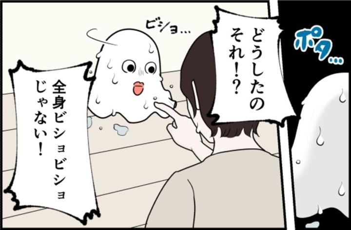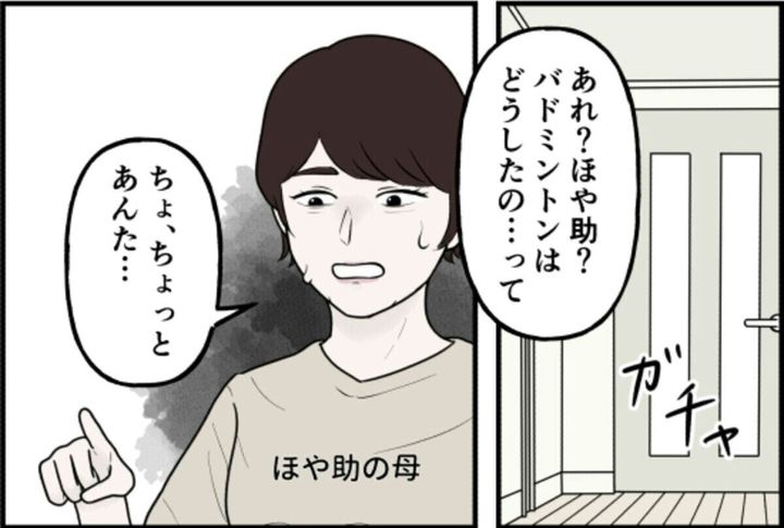 キュアおじが車で去り、解放されて家にたどり着いたほや助さん。バドミントンの練習に行っているとばかり思っていたお母さんは、びしょ濡れで帰宅したほや助さんの姿に目を丸くします。