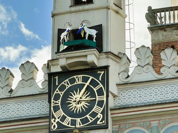 ヤギ伝説とは、1551年、市庁舎のオープンセレモニーでゲストに提供される料理の材料だった2頭のヤギが、料理される直前に塔の中に逃げ込み、ケンカをはじめたというものです。その姿がポズナンのシンボルになっています。