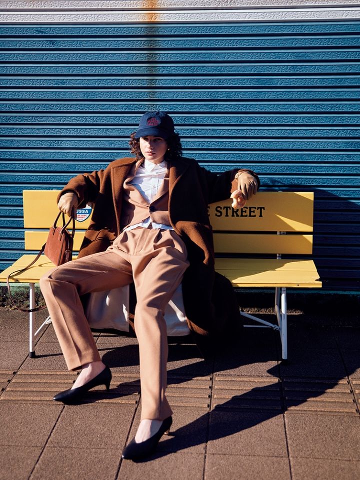 服に左右されず遊びを足せるキャップは、クラシカルな配色で選べば合わせるスタイリングの幅も広く。ベージュのセットアップにブラウンのコートを重ねて、レイヤードの奥行きを効果的に活用。さらに白シャツを中に仕込めば、スキのないスタイリングに。
