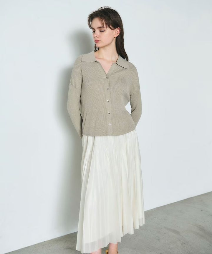 襟付きで前ボタンのついたシャツタイプのニットは、今注目のアイテム。着るだけで今っぽさ抜群です。