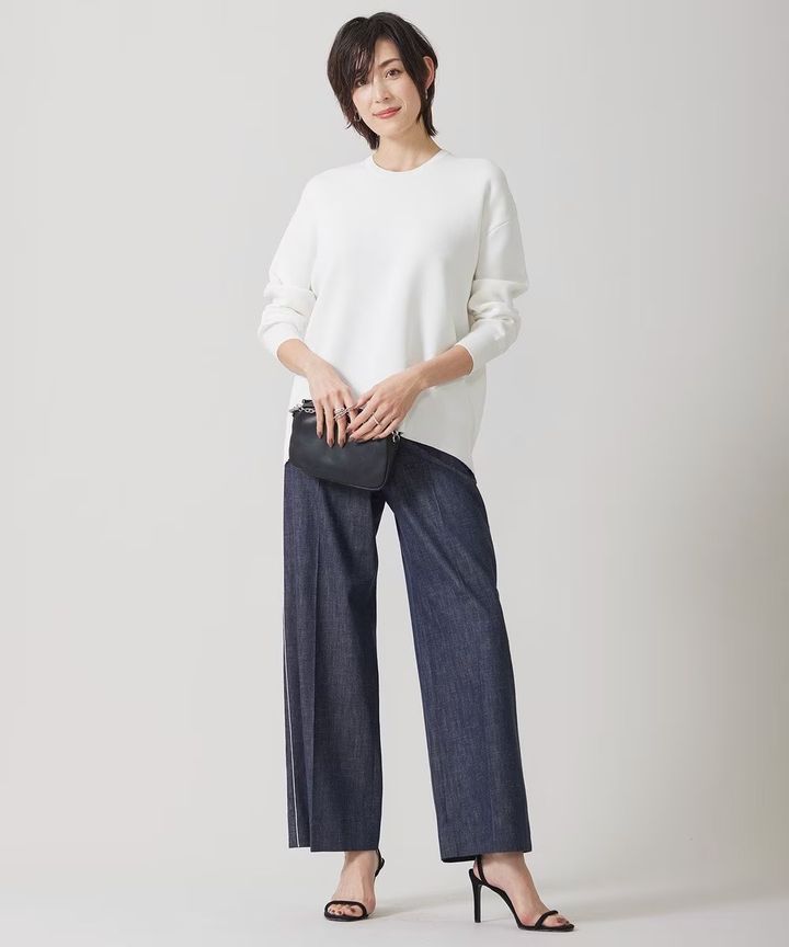 目が詰まり、スウェットのように着られるニットは、きれいめコーデカジュアルコーデのどちらにも使える着回し力の高いアイテムです。